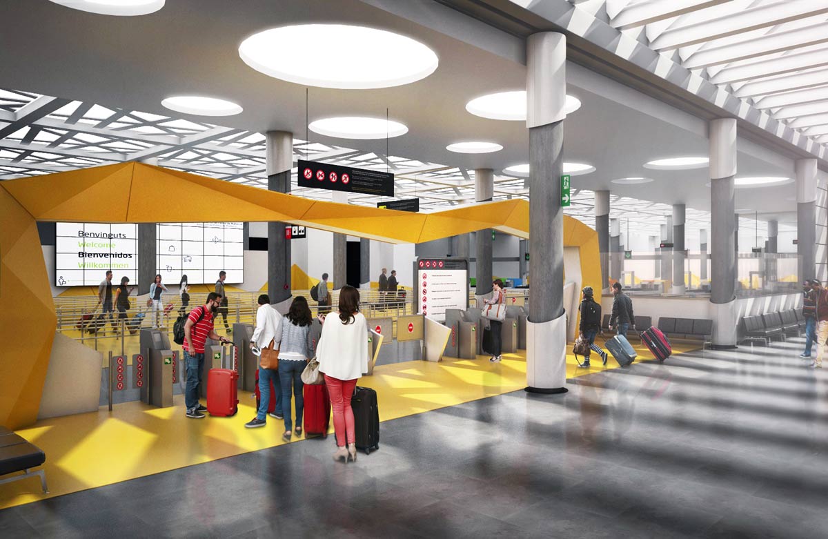 Este trabajo consiste en rediseñar las zonas de fachada, embarque, acceso a los filtros y los pasillos, para crear una imagen más moderna a la vez que se habilitan nuevos espacios de estancia, creando un ambiente actual y confortable para los visitantes.